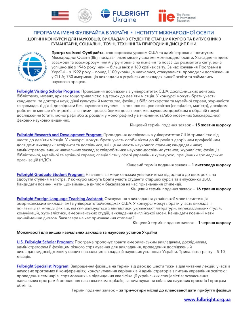 У п’ятницю, 26 лютого о 15:00 відбудеться презентація програм імені Фулбрайта на платформі Zoom Meeting. Короткий опис програм імені Фулбрайта додається в форматі pdf.