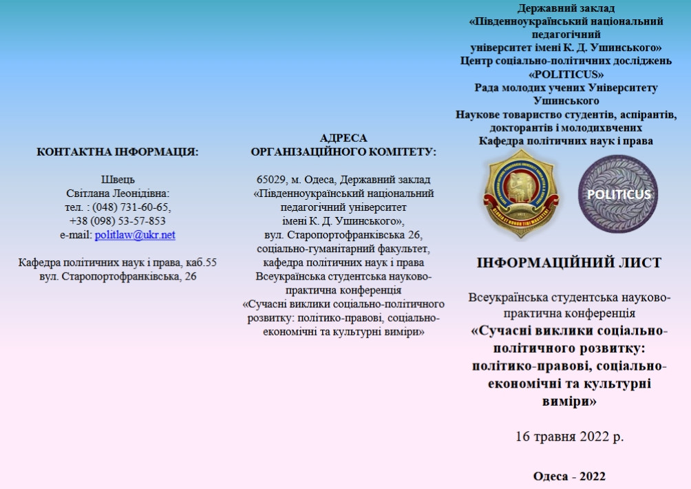 Кафедра політичних наук і права запрошує Вас взяти участь у Третій Всеукраїнській студентській науково-практичній конференція «Сучасні виклики соціально-політичного розвитку: політико-правові, соціально-економічні та культурні виміри» яка відбудеться 16 травня 2022 р. у Державному закладі «Південноукраїнський національний педагогічний університет імені К. Д. Ушинського».