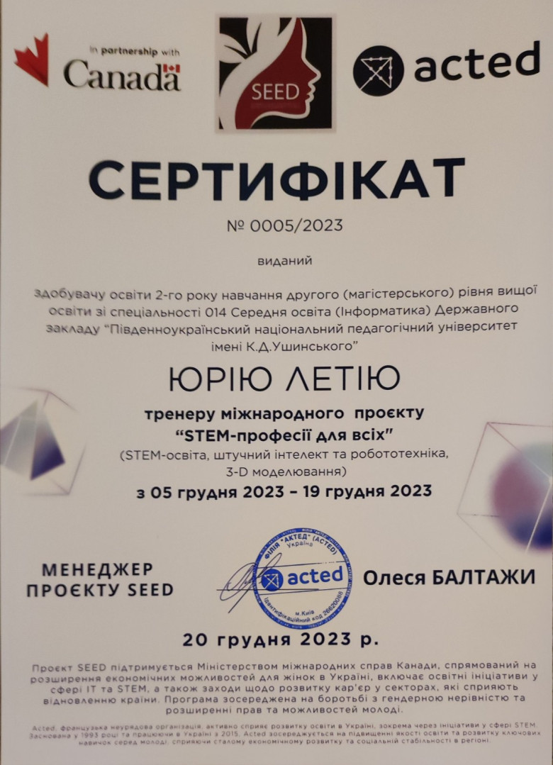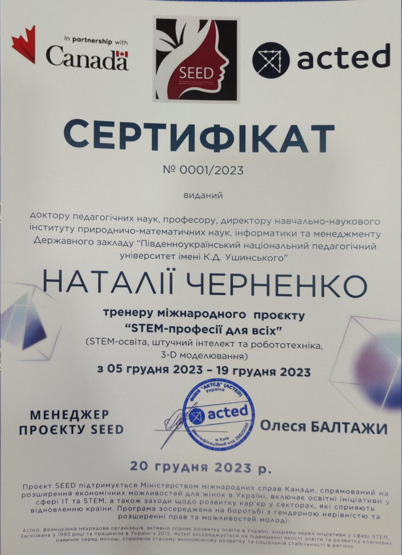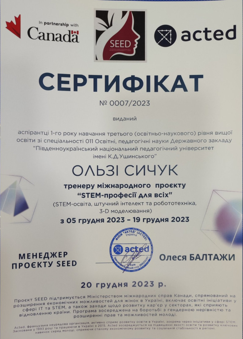 2У межах міжнародного проєкту SEED «STEM-професії для всіх», що фінансується та підтримується міжнародною організацією Acted, викладачі та магістранти Університету імені Ушинського взяли активну участь у реалізації цієї значущої ініціативи. Проєкт SEED має на меті стимулювати зацікавленість і розвиток навичок у сфері STEM (наука, технології, інженерія, математика) серед молоді, зокрема серед дівчат та молодих жінок, для забезпечення їх рівних можливостей у майбутній кар'єрі.
