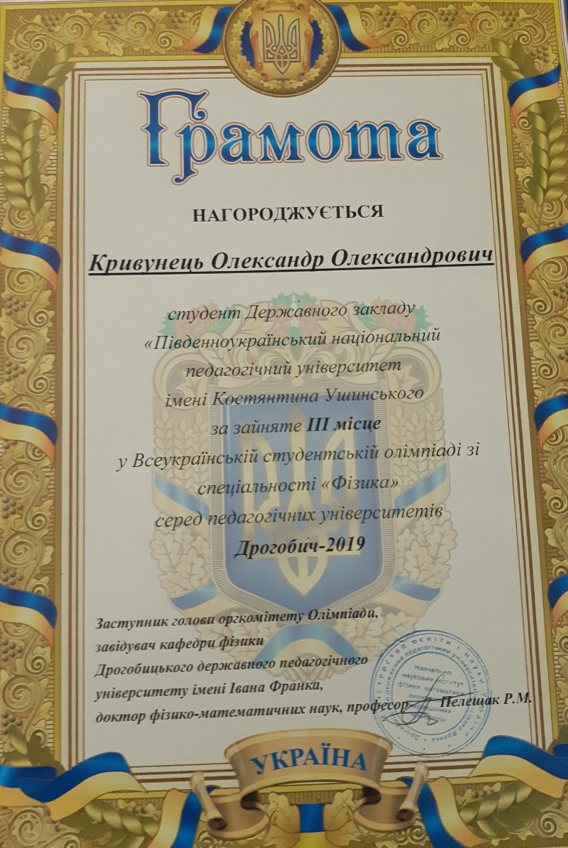 З 15 по 17 квітня 2019 року у м. Дрогобич проходила Всеукраїнська олімпіада зі спеціальності «Фізика» серед педагогічних університетів. За результатами олімпіади, третє почесне місце посів студент фізико-математичного факультету Університету Ушинського першого року навчання за другим (магістерським) рівнем освітно-професійної програми Середня освіта (Фізика) Кривунець Олександр Олександрович.