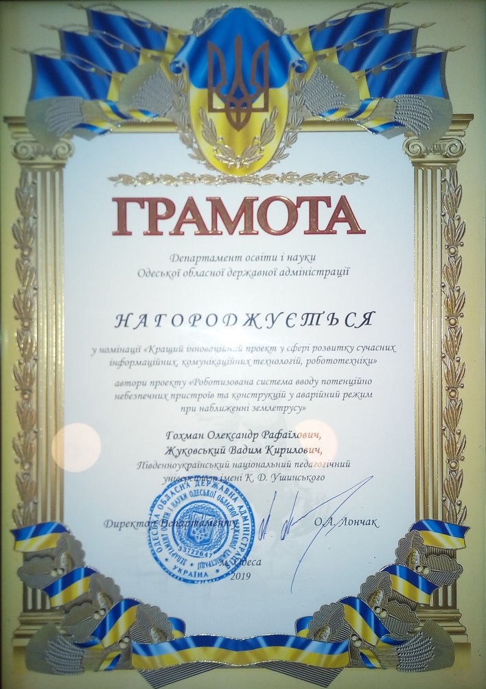 У номінації «Кращий інноваційний проект у сфері розвитку сучасних інформаційних, комунікаційних технологій, робототехніки» переможцями стали викладачі фізико-математичного факультету Університету Ушинського: професор, завідувач кафедри фізики Гохман Олександр Рафаїлович і доцент кафедри фізики Жуковський Вадим Кирилович як автори проекту «Роботизована система вводу потенційно небезпечних пристроїв та конструкцій у аварійний режим при наближенні землетрусу».