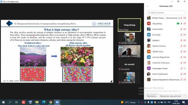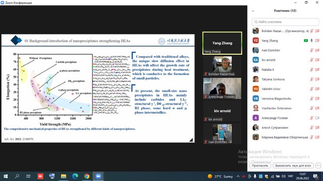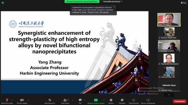 Доктор Чжан у своєї лекції доповів про особливості високоентропійних сплавів та стратегію щодо одночасного поліпшення їх пластичних та міцних властивостей.