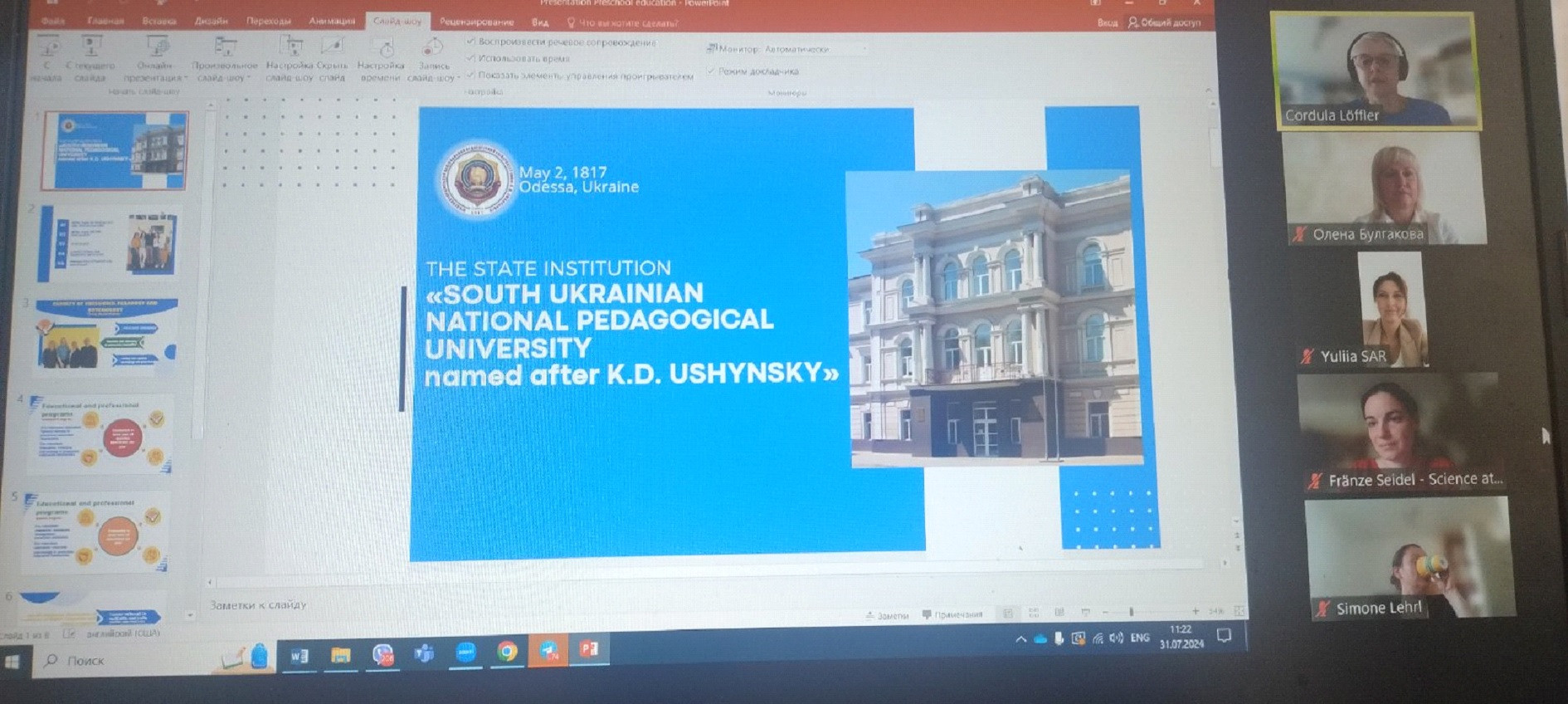 31 липня 2024 року відбулася організаційна зустріч з німецькими колегами з University of Education Weingarten (Німеччина) з метою налагодження академічних та наукових зв’язків між університетами. Проректор з наукової роботи Ганна Музиченко представила німецьким колегам науковий потенціал університету, а декан факультету дошкільної ппедагогіки і психології Олена Булгакова - факультет та можливості для співпраці в сфері дошкільної педагогіки, зокрема для участі в наукових заходах факультету.