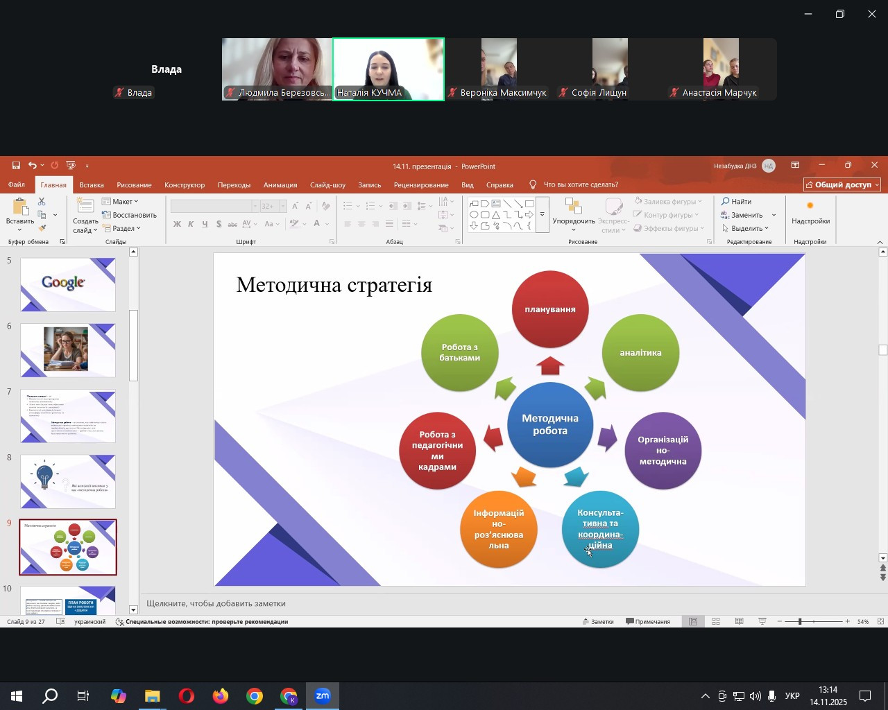 Значну увагу лекторка приділила практичним аспектам організації методичної роботи в ЗДО, поділившись цікавими кейсами з власного досвіду, які стосувалися ефективного управління педагогами, оптимізації їхньої взаємодії, вирішення проблемних ситуацій у професійній діяльності; розповіла про принципи та етапи планування методичної роботи, продемонструвала, як грамотне планування сприяє підвищенню рівня професійної компетентності педагогічного колективу, стимулює до творчого пошуку та впровадження інновацій у освітній процес; навела приклади успішної організації методичних об’єднань, творчих лабораторій, які забезпечують не лише обмін досвідом, а й розвиток креативності, інноваційного мислення та ініціативності у педагогів.