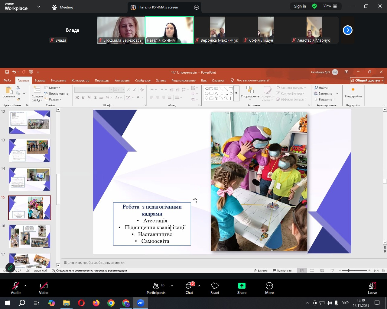 14 листопада 2025 р. у межах опанування освітнього компоненту «Методична робота в ЗДО різного типу» для здобувачів першого (магістерського) рівня вищої освіти освітньо-професійної програми «Дошкільна освіта. Керівник закладу дошкільної освіти» було організовано гостьову лекцію. Спікеркою заходу виступила Кучма Наталія Анатоліївна – вихователь-методист Комунального закладу «Заклад дошкільної освіти № 3 “Незабудка” м. Кропивницького», магістерка спеціальної освіти, фахівчиня вищої кваліфікаційної категорії, а також координаторка освітніх проєктів громадської спілки «Про Дитинство».
