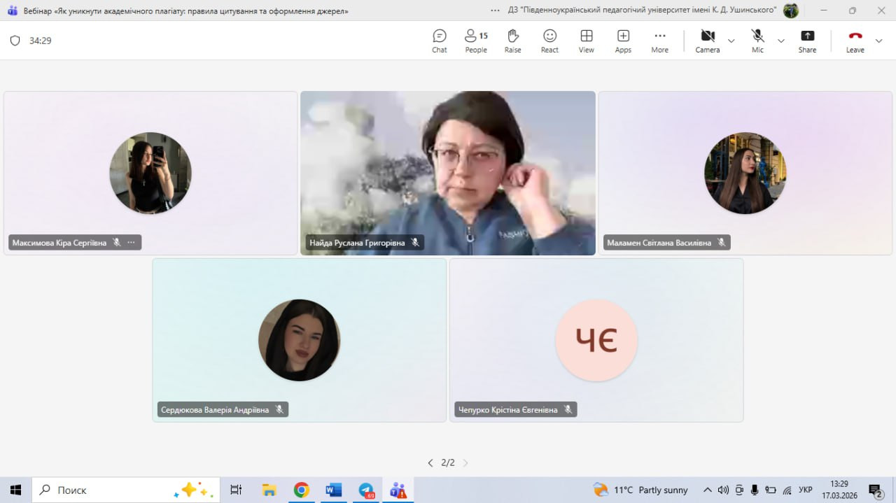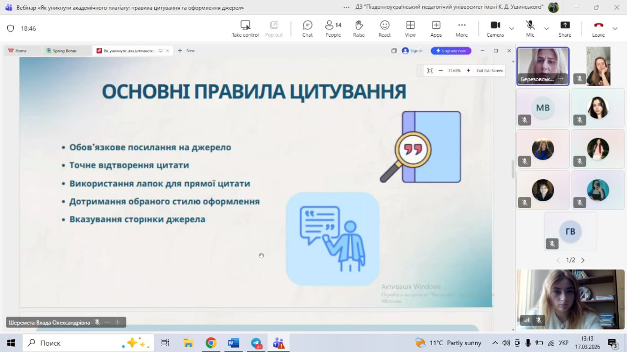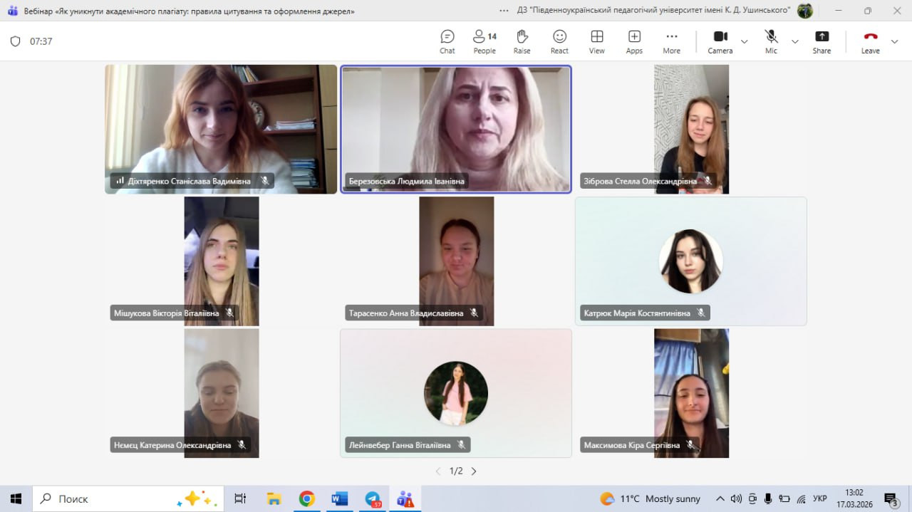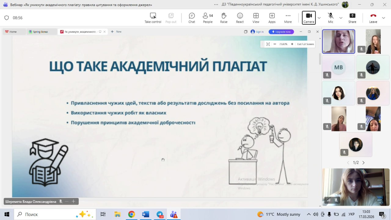 17 березня зі студентами третього курсу спеціальності 012 «Дошкільна освіта» було проведено вебінар на тему «Як уникнути академічного плагіату: правила цитування та оформлення джерел». У межах вебінару учасники були ознайомлені із Законом України «Про академічну доброчесність», його ключовими положеннями та вимогами до виконання навчальних і наукових робіт; розглянуто сутність академічної доброчесності, основні види плагіату та способи його уникнення. Значну увагу приділено правилам цитування, оформленню списку використаних джерел відповідно до чинних стандартів.