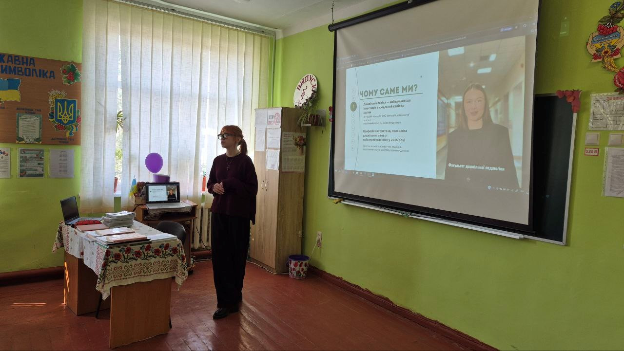 До старшокласників завітала студентка другого курсу Олександра Шамшиєва, яка поділилася особливостями навчання за спеціальністю А2 «Дошкільна освіта». Олександра розповіла про власний досвід і насичене студентське життя. Разом з учнями вони обговорили: