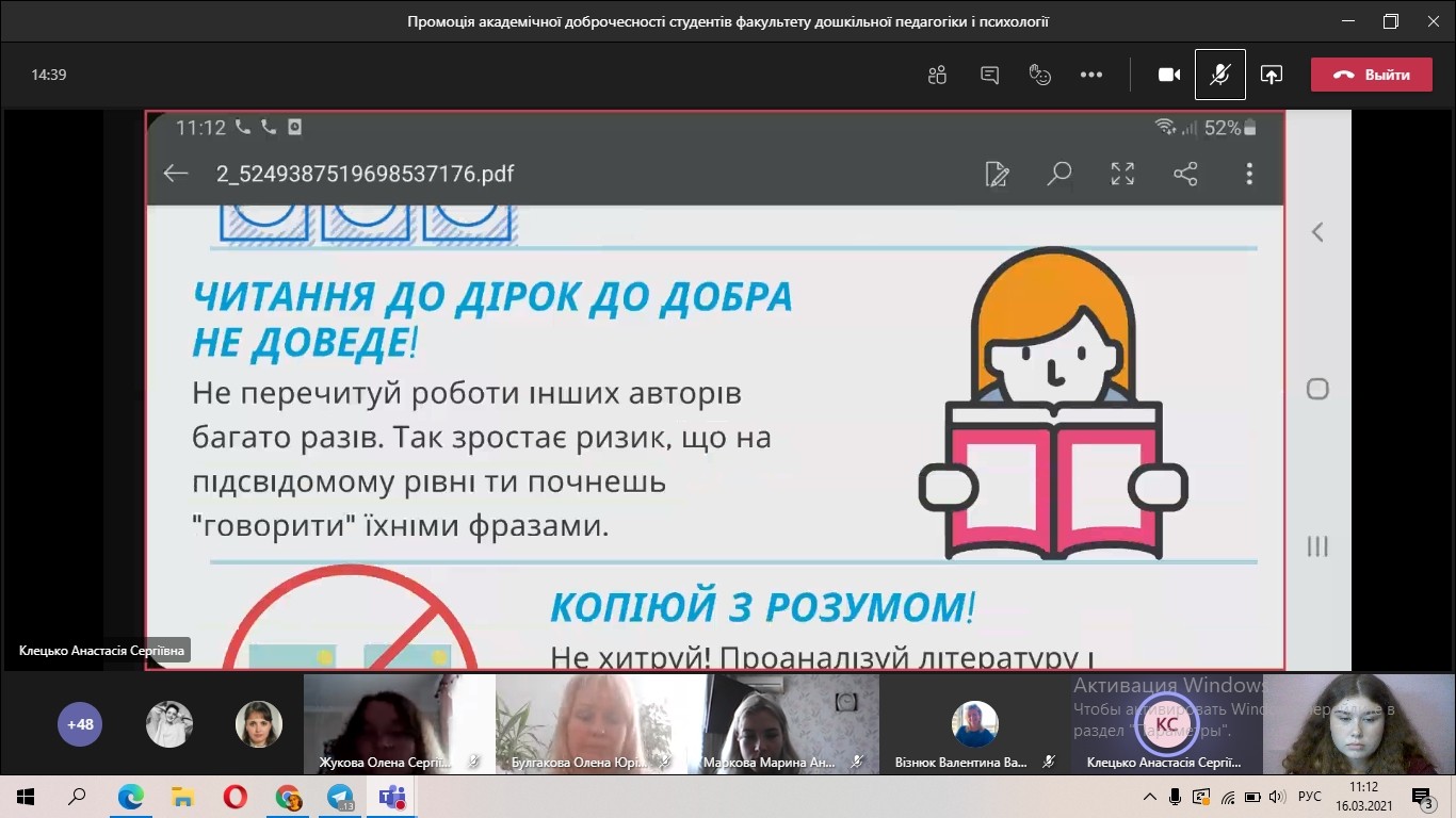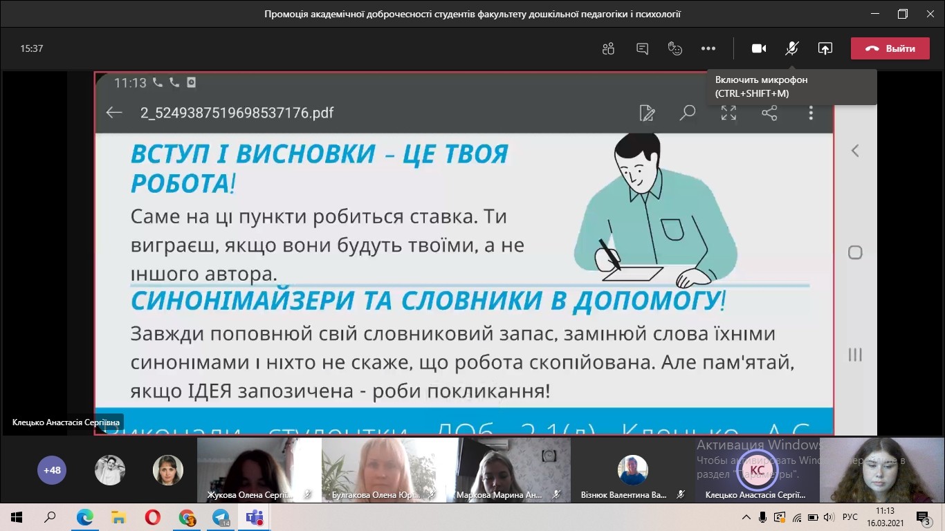 16 березня 2021 року в межах Тижня доброчесності в Державному закладі «Південноукраїнський національний педагогічний університет імені К. Д. Ушинського» на факультеті дошкільної педагогіки та психології відбулась промоція академічної доброчесності. Студенти 2 року навчання спеціальності 012 «Дошкільна освіта» підготували групові проєкти з рекомендаціями: «Як вилікувати студента від плагіату», «Вакцинація студентів від Cntr-C – Cntr-V».