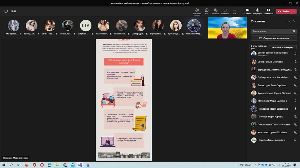 Під час онлайн-заходу декан факультету дошкільної педагогіки та психології Олена Булгакова наголосила на важливості дотримання академічної доброчесності всіма учасниками освітнього процесу. Студенти Анастасія Дибець, Анна Завгородня, Дар’я Колісниченко, Карина Кронштадтова, Марія Ніколенко, Катерина Паламарчук, Валерія Пінонік, Тетяна Похольченко і Ірина Холостенко презентували проєкти з порадами для студентів щодо уникнення доброчесності та підвищення якості дослідження. Голова студентської ради факультету дошкільної педагогіки та психології Людмила Верещагіна підкреслила важливість доброчесності в академічній групі.
