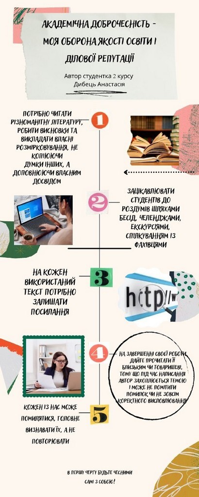 7 квітня 2022 року на факультеті дошкільної педагогіки та психології Південноукраїнського національного педагогічного університету імені К. Д. Ушинського відбувся круглий стіл з теми «Академічна доброчесність – моя оборона якості освіти і ділової репутації». Учасники заходу обговорили вплив доброчесності на якість освіти та майбутню кар’єру педагога. Студенти 2 року навчання спеціальності 012 «Дошкільна освіта» підготували проєкти з рекомендаціями щодо уникнення академічного плагіату. Модератором онлайн-зустрічі виступила викладач кафедри дошкільної педагогіки Валентина Візнюк.