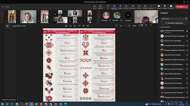 Студенти та куратори академічних груп з інтересом сприймали матеріал, жваво реагували на пропоновану інформацію, активно брали участь у обговоренні. Студенти, які вимушено перебувають за кордоном, висловили свої особисті враження щодо ставлення іноземців до української національної святині. Вишиванка об’єднує українців по всьому світу, а барвисті кольори та магічні узори-символи додають сил витримати всі випробування долі!