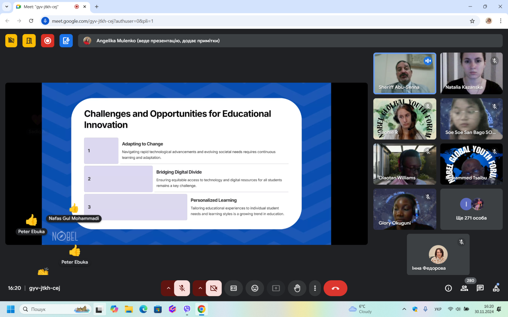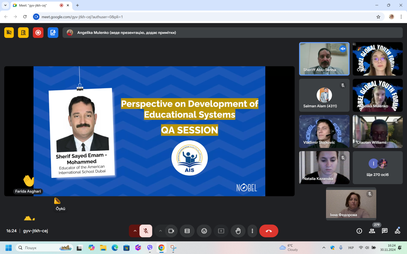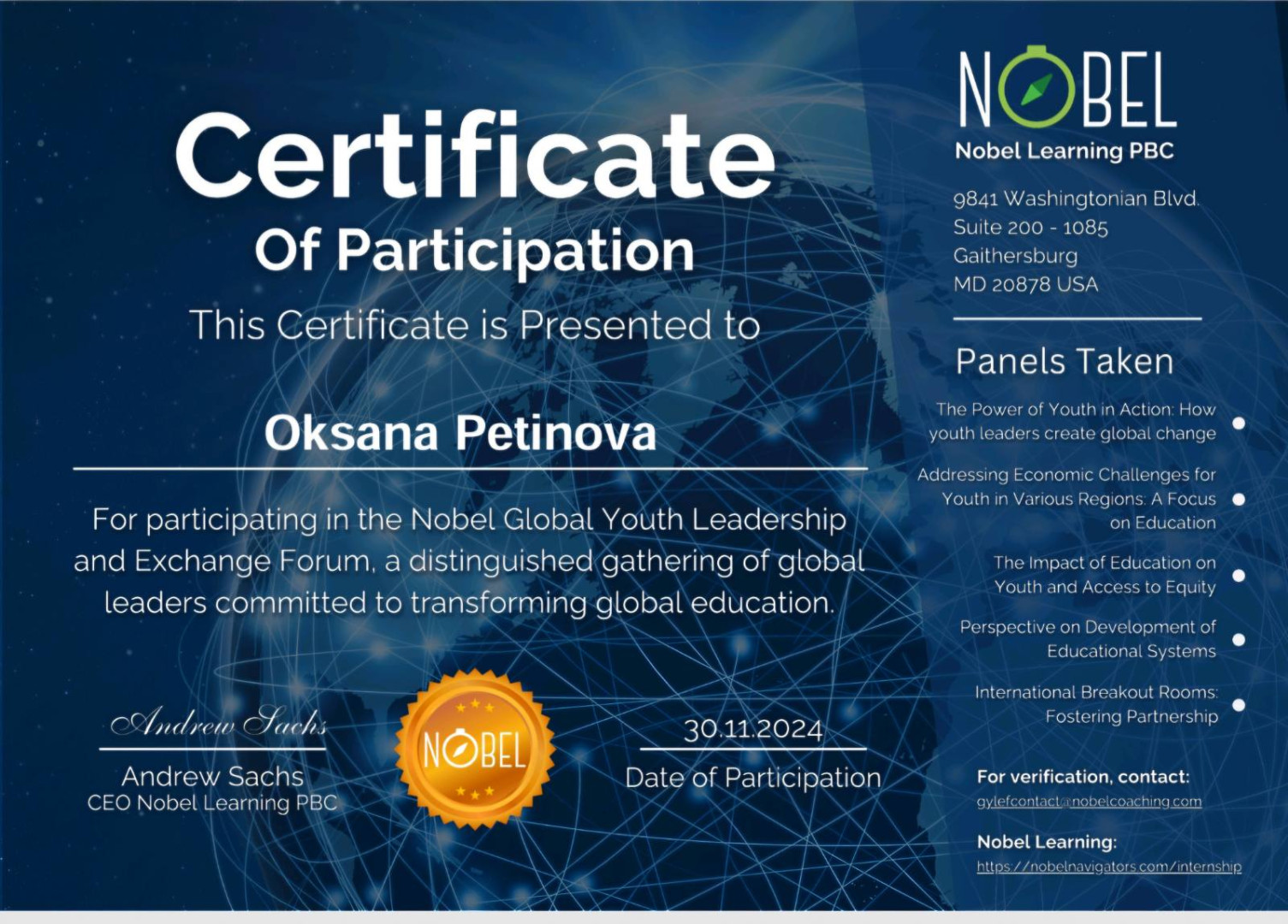1Здобувачі третього (освітньо-наукового) рівня вищої освіти ОНП «Філософія» разом із Гарантом ОНП проф. Оксаною Петіновою взяли участь у міжнародному заході Nobel Global Youth Leadership and Exchange Forum. Організатори - Міжнародна компанія Nobel Learning PBC разом із партнерами та інституціями понад 15 країн світу. Учасники та гості події – представники бізнесу, громадського сектору, політики та освіти понад 157 країн світу. Участь у заході сприяла формуванню глобального світогляду, розумінню міжкультурної специфіки та комунікації, а також здатності до співпраці у міждисциплінарному та мультикультурному середовищі. Захід став важливим етапом для формування у аспірантів філософського розуміння сучасних викликів та їхнього вирішення в умовах глобалізації. Вони отримали практичний досвід застосування філософських концепцій у реальному світі, що підвищує їхню конкурентоспроможність на міжнародному рівні та сприяє підготовці до викладацької, дослідницької та консультаційної діяльності. Захід спрямовано на розвиток практичних навичок та soft skills,  що сприятиме подальшому професійному становленню та особистісному розвитку аспірантів. Активну участь в обговоренні питань інновацій в освіті взяли Інна Федорова та Микола Начев.