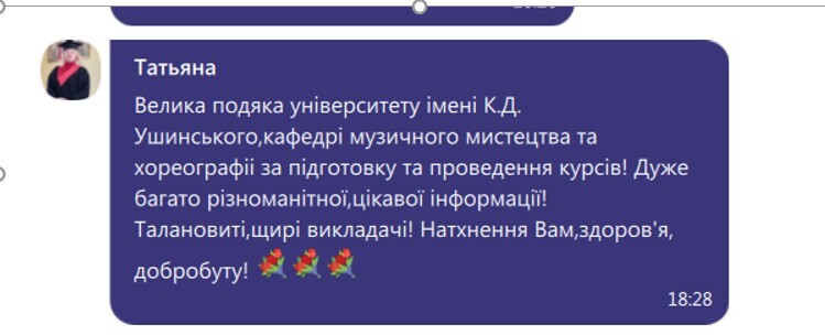Сподіваємося, що високий рівень організації курсів підвищення кваліфікації та фаховий рівень викладачів буде сприяти підвищенню якості викладання мистецьких дисциплін у закладах загальної середньої освіти вчителями, які були слухачами на зазначених програмах. Цікаво, що до сих пір учителі спілкуються у Viber групі та отримують рекомендації і поради.