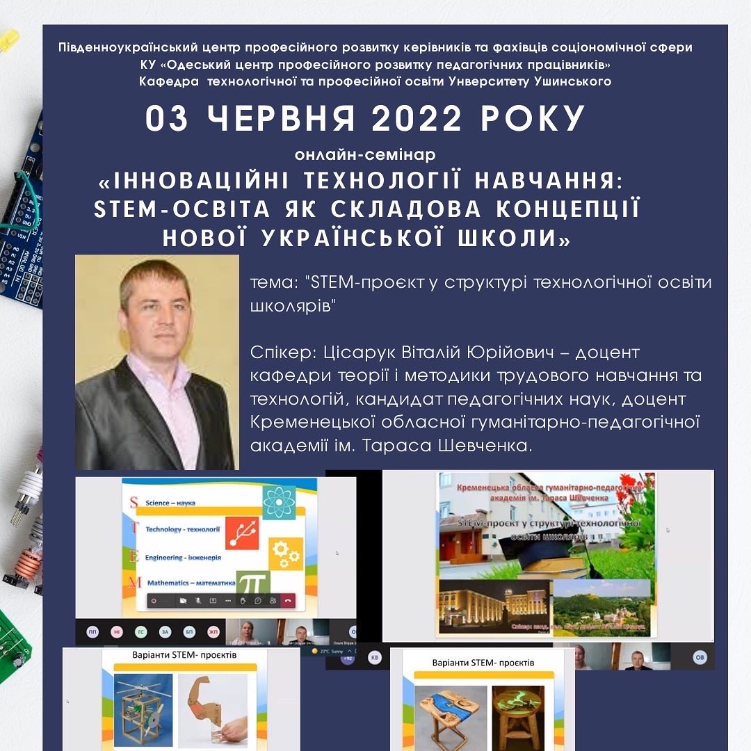 03 червня 2022 року на базі Південноукраїнського центру професійного розвитку керівників та фахівців соціономічної сфери Університету Ушинського за підтримки кафедри технологічної та професійної освіти та КУ «Одеський центр професійного розвитку педагогічних працівників» у межах курсів підвищення кваліфікації відбувся онлайн-семінар «Інноваційні технології навчання: STEM-освіта як складова концепції Нової української школи».Під час семінару було розкрито такі питання: