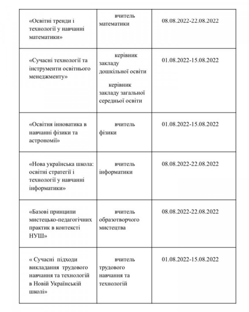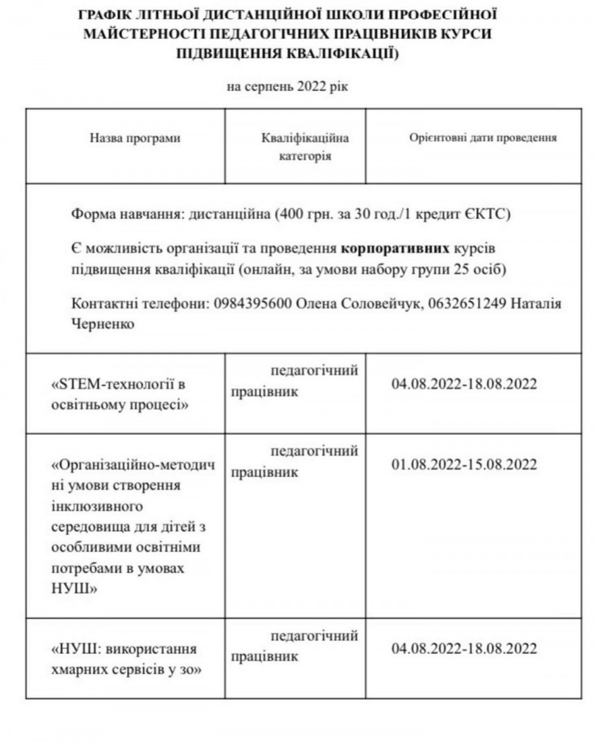 Серпень 2022 року Обсяг: 30 годин/ 1 кредит ЄКТС Формат навчання: дистанційно Вартість: 400 гривень Для вчителів ЗЗСО, вихователів ЗДО, педагогічних працівників, керівних кадрів закладів освіти, практичних психологів та соціальних педагогів Анкета реєстрації доступна за посиланням: