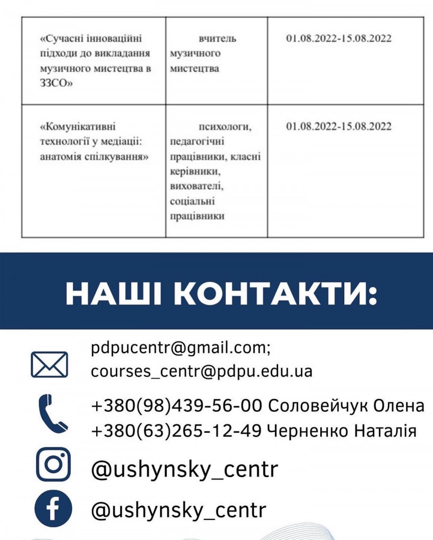 Детальна інформація за телефоном: +380(98)-439-56-00 Соловейчук Олена Поспішайте, кількість місць обмежена! Будемо раді бачити вас у Літній дистанційній школі професійної майстерності педагогічних працівників на базі Південноукраїнського центру професійного розвитку керівників та фахівців соціономічної сфери Університету Ушинського