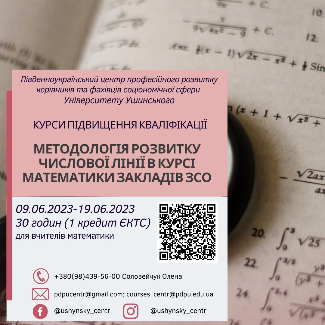 Курси підвищення кваліфікації для вчителів математики на базі Південноукраїнського центру професійного розвитку керівників та фахівців соціономічної сфери! Увага! Оголошується реєстрація на курси підвищення кваліфікації за програмою: «Методологія розвитку числової лінії в курсі математики закладів ЗСО»(для вчителів математики) 09.06.2023р.- 19.06.2023р., обсягом 30 годин