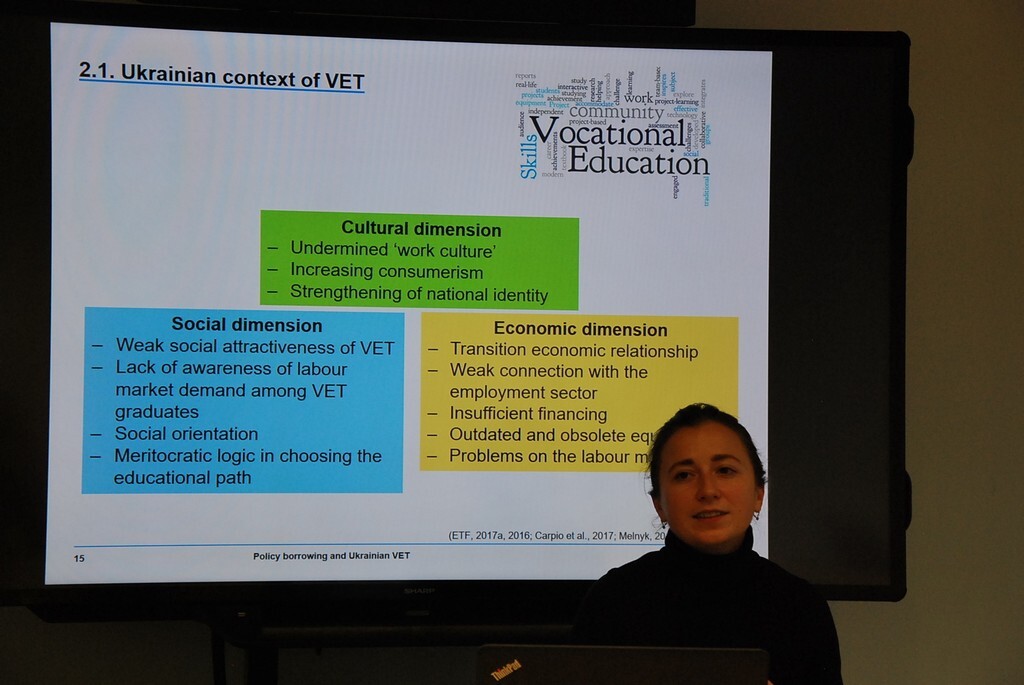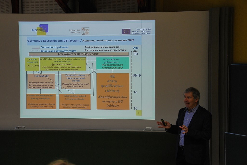 Учасники ознайомилися зі структурою навчальної програми підготовки магістрів за спеціальністю "Економічна та бізнес освіта" в Університеті Констанца, за якою готують майбутніх викладачів для закладів ПТО комерційного профілю, та основними концепціями співпраці в дослідженнях, досвідом співпраці з університетами Східної Європи, а також з міжнародним співробітництвом у сфері підготовки викладачів для професійно-технічних навчальних закладів. Співробітники Університету Констанца представили конкретні приклади підготовки викладачів у федеральній землі Баден-Вюртемберга та проходження шкільної практики за кордоном в рамках навчання в університеті студентських стажувань. Розглянуто також розвиток політики у сфері підготовки та підвищення кваліфікації педагогічних кадрів в Україні та вплив на неї меритократії. Українські партнери мали можливість відвідати професійно-технічне училище Zeppelin Gewerbe Schule та отримати інформацію про діяльність робочої групи студентів-педагогів AK WiPäd.