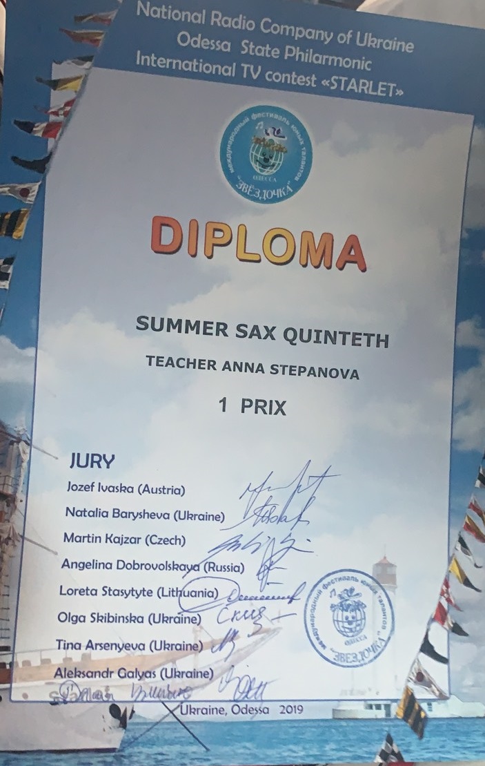 30 травня в Одеській філармонії пройшов Міжнародний фестиваль-конкурс «Зірочка», перемогу та звання лауреата 1 премії в якому одержав ансамбль саксофоністів у складі Лі Чженьтао, Сун Сяодун, Ван Биньбинь, Чжан Тин, Ян Ханьжи, Ли Донзе, Ван Вейдже (клас викладача Ганни Степанової).