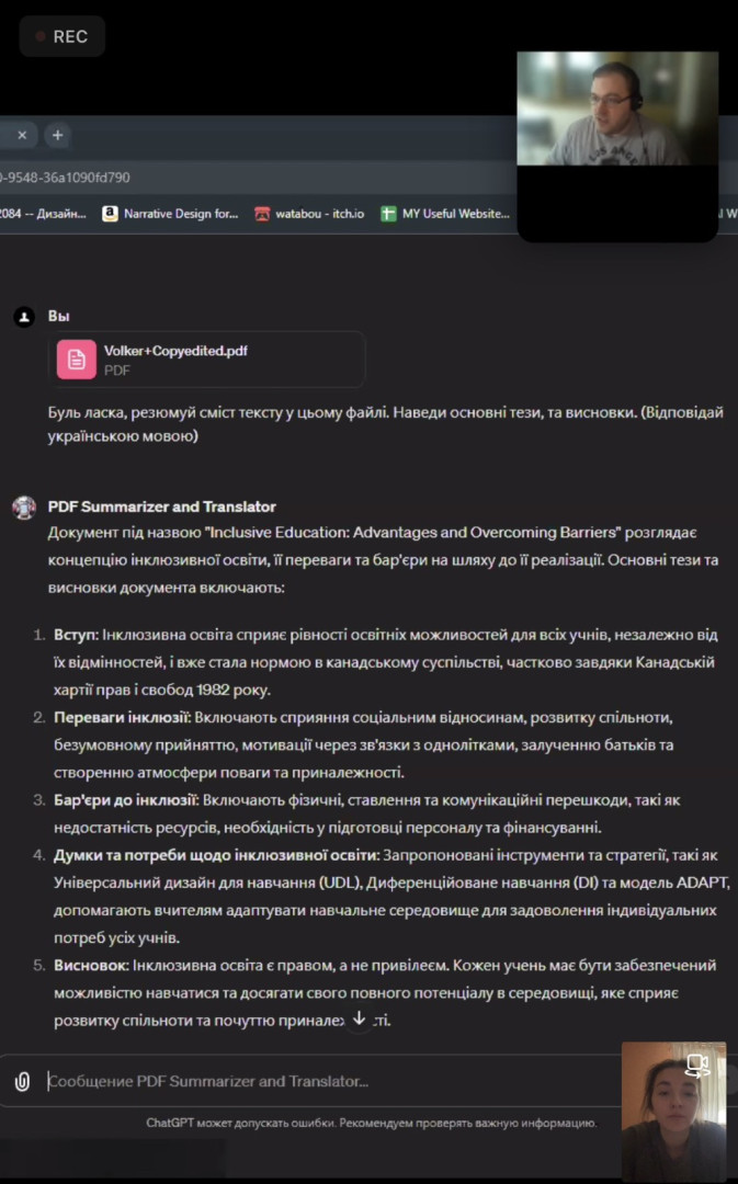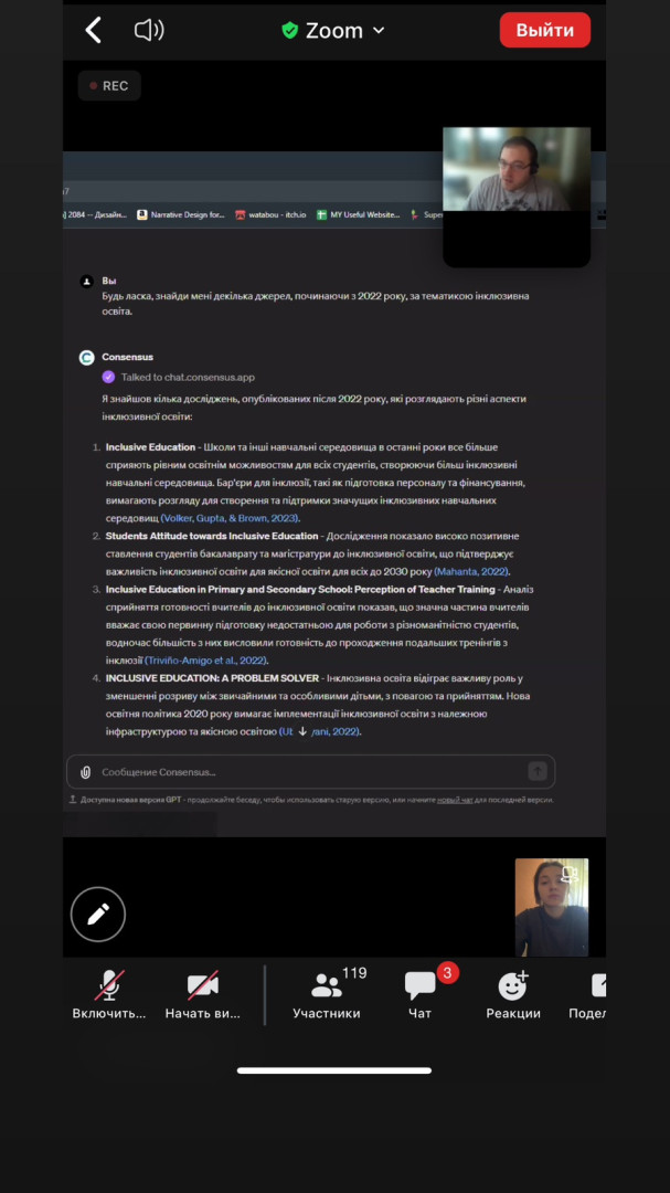 Students of the educational and professional program Secondary Education (Physical Culture) of the second (master's) level of higher education joined the master class for students of education and scientific and pedagogical workers of Ushinsky University on February 29, 2024 under the program: "GPT-store. AI services in education" and "AI in education and science" on March 1, 2024, organized by the South Ukrainian Center for the Professional Development of Managers and Specialists in the Socioeconomic Field with the support of the educational laboratory of artificial intelligence and robotic systems of the educational and scientific institute of natural and mathematical sciences, informatics and management.