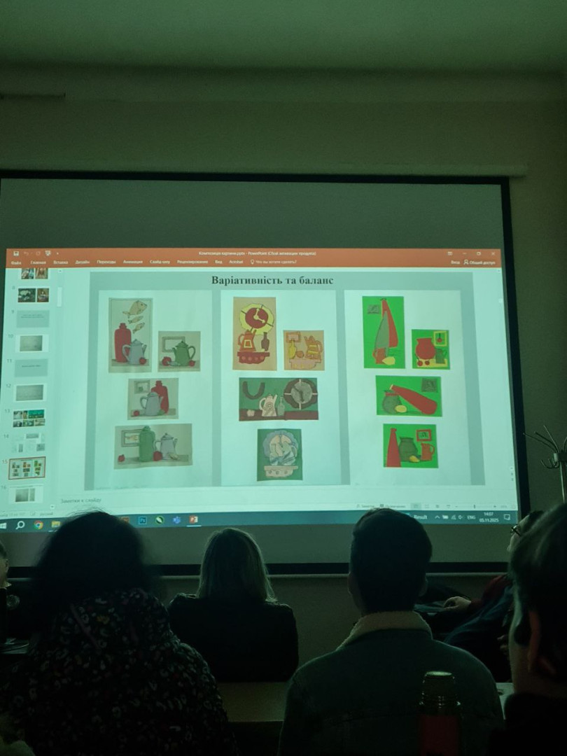 On November 5, 2025, the Faculty of Fine Arts and Graphics of Ushynsky University hosted a guest master class “Composition: Building an Image on a Picture Field,” which was held for students of various specialties, teachers and guests of the faculty by Tetyana Mykolaivna TYKHOMYROVA (Ishchenko), a methodologist of the Odesa Regional Educational and Methodological Center of the Institution of Culture and Art, teacher-methodologist of K.K. Kostandi Art School.