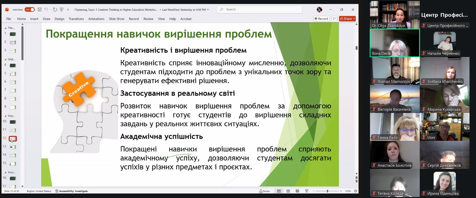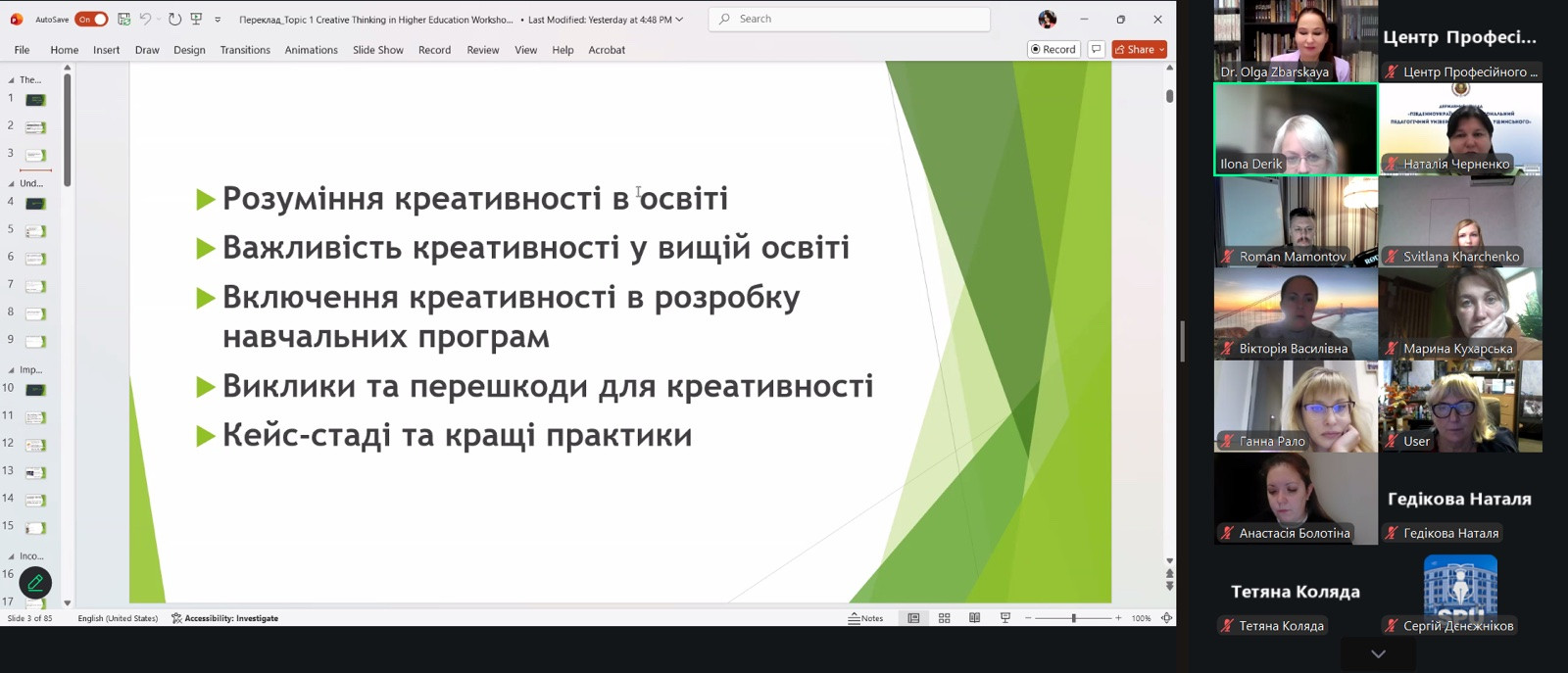 On November 5, 2025, a guest lecture “The Role of Creativity in Higher Education: Promoting Innovation and Critical Thinking” was held within the discipline “Educational and Educational Activities in the Field of Psychology” for master's degree students of the Higher Education Institution “Practical and Applied Psychology” with Olha Zbarskaya, Doctor of Philosophy in Psychology and Administration of the Socioeconomic Sphere, member of the US Academy of Clinical and Social Work (ACSW), member of The Textbook & Academic Authors Association, expert in accreditation of educational courses, expert in the field of human creative potential, founder and president of the company “OZCREDO”. During her speech, the speaker emphasized the importance of developing creative thinking in the conditions of modern higher education, emphasizing that creativity today is the key competence of a teacher and a student. Particular attention was paid to practical strategies for stimulating creativity, an innovative approach to learning and integrating modern educational technologies into professional training of specialists, and taking them into account when developing educational and educational programs.