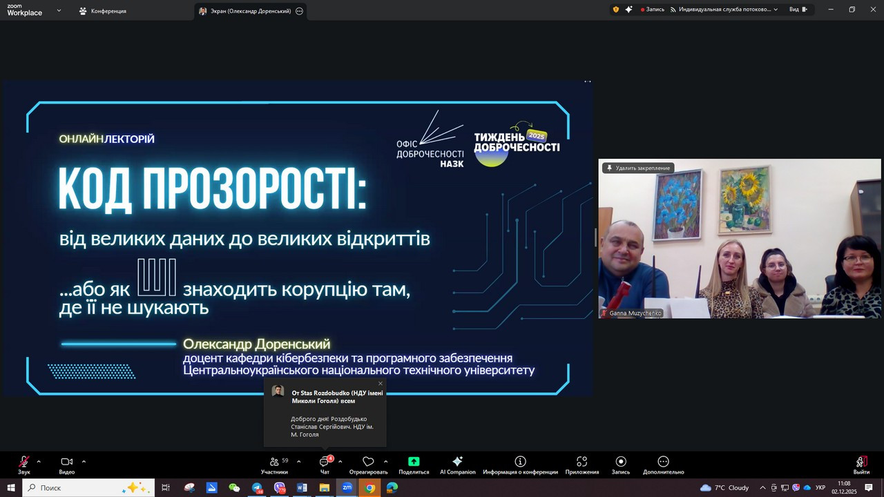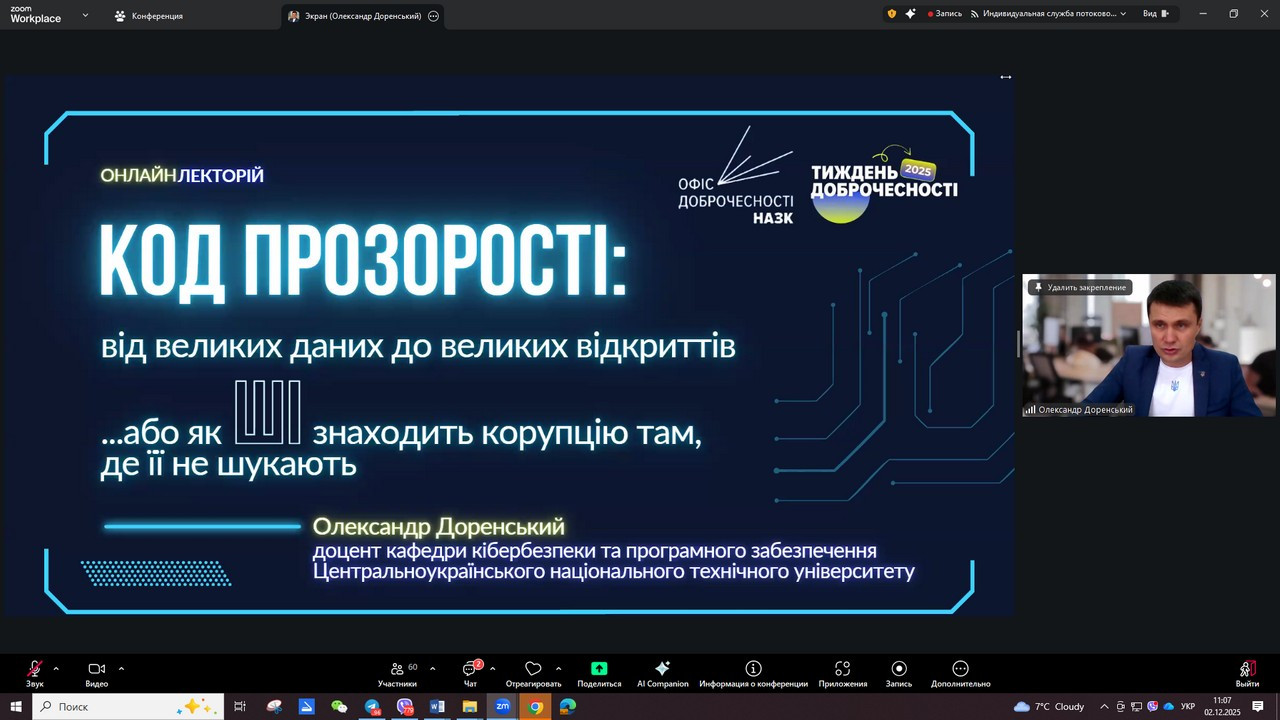 lecture "The Transparency Code: From Big Data to Big Discoveries or How AI Finds Corruption Where It Is Not Looking", speaker - Oleksandr Dorensky, Candidate of Technical Sciences, Associate Professor of the Department of Cybersecurity and Software of the Central Ukrainian National Technical University.