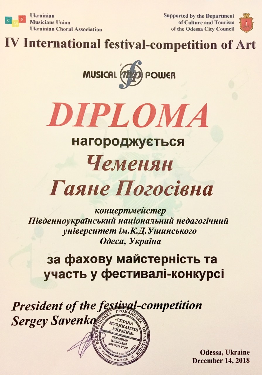 Congratulations to the graduate student of the Faculty of Music and Choreography Maria Samulyak (class teacher T. N. Tolstova, concertmaster G.P. Pogosyan) with the victory and the title of First Class Laureate in the nomination "Academic Vocal" at the IV International Festival "Musical Power 2018", which took place on December 14 in Odesa.