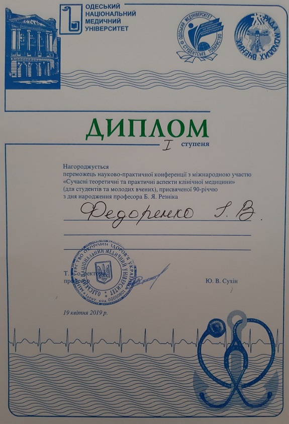 Participants of the scientific student problem group of the Laboratory of Physiology of Sports named after T. M. Tsoneyva of the Department of Biology and Healthcare of South Ukrainian National Pedagogical University named after K. D. Ushynsky successfully spoke at the scientific-practical conference with international participation "Modern theoretical and practical aspects of clinical medicine , held on April 18-19, 2019 in Odesa.
