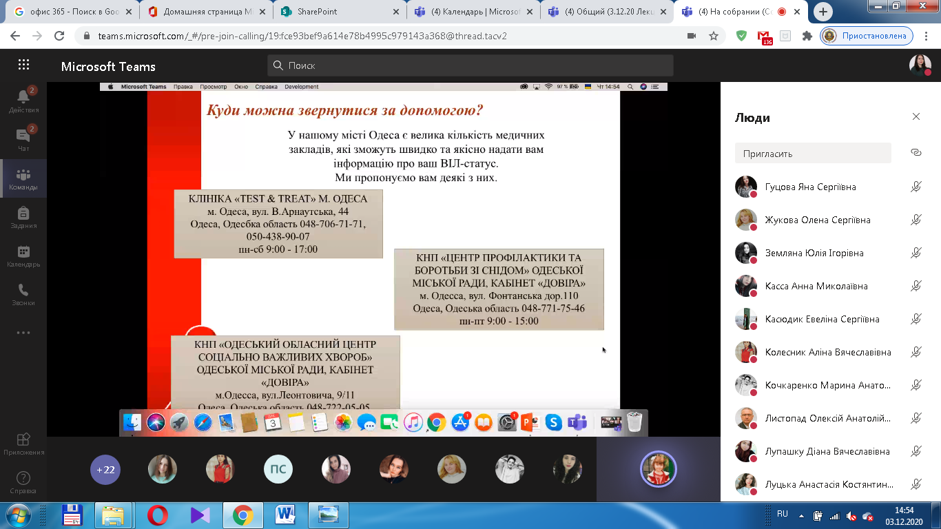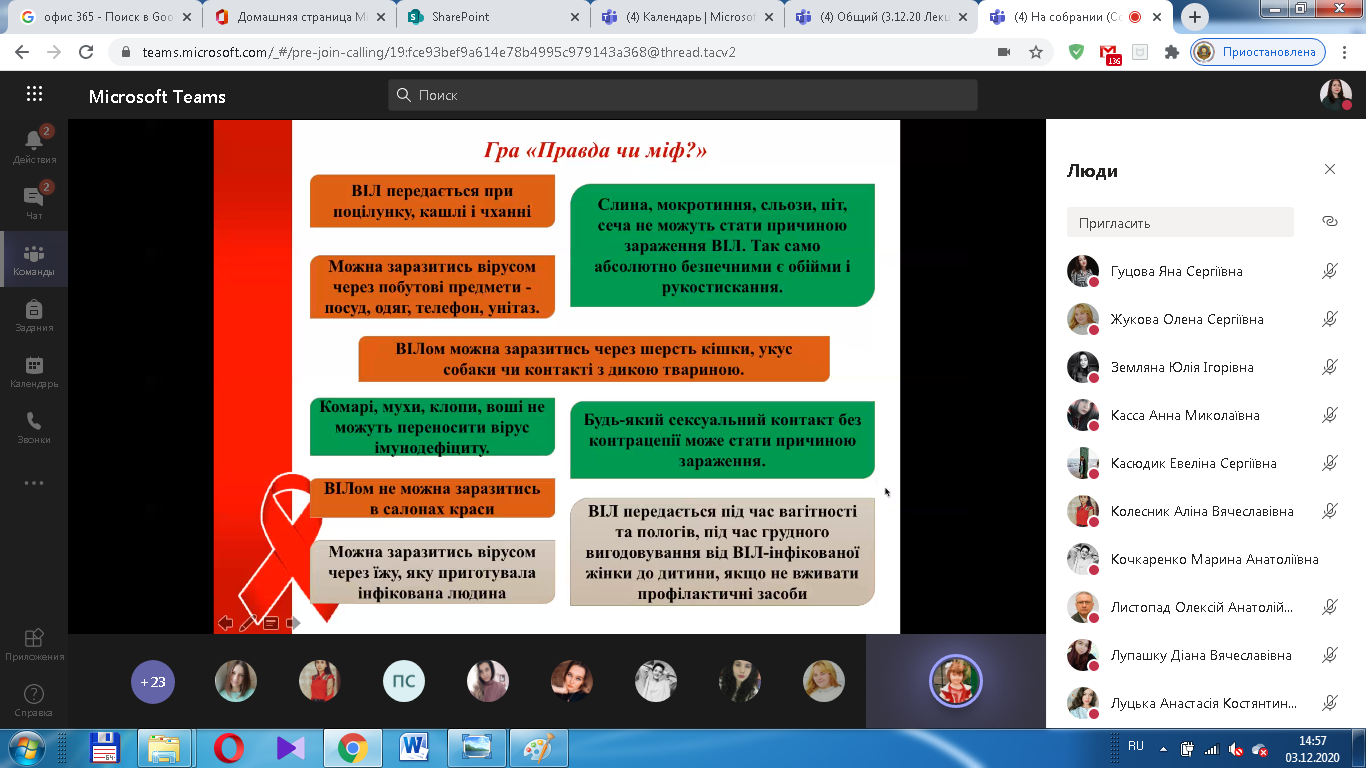 December 1 is World AIDS Day and understanding with HIV-positive people. "Who is warned - is protected" - under this slogan in early December 2020 at the Faculty of Preschool Pedagogy and Psychology of Ushynsky University was an educational event "HIV / AIDS - all that is important to know", which was prepared by students of 3 years of study: Ye. Volovina, T. Dyulger, V. Zayonchkovska, A. Palosh under the guidance of Doctor of Pedagogical Sciences, Professor O.A. Listopad, Candidate of Pedagogical Sciences, Associate Professor I.K. Mardarova. The event was attended by the Dean of the Faculty of Preschool Pedagogy and Psychology, Doctor of Psychology, Associate Professor O. Yu. Bulgakova, Deputy Dean for Educational Work, Ph.D., senior teacher A.I. Prosenyuk, the students of the first-third years of study.