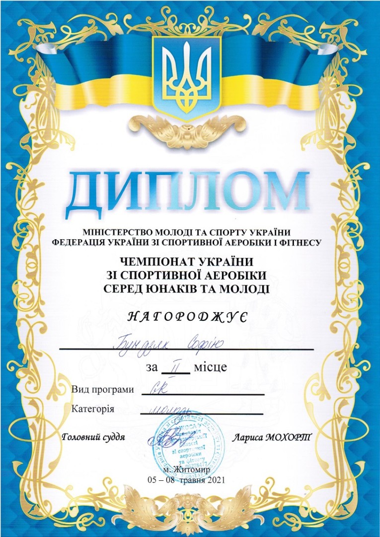 May 5-8, 2021 in Zhytomyr was the Championship of Ukraine in sports aerobics among youth and youth. We sincerely congratulate the students of the Educational and Scientific Institute of Physical Culture, Sports and Rehabilitation of Ushynsky University Bundziak Sofia (member of the national team of Ukraine in sports aerobics, order of the Ministry of Youth and Sports of Ukraine from 05.02.2021 № 360), Sofronova Valeria, Khamutynska Alona with new sports achievements during these sports competitions.
