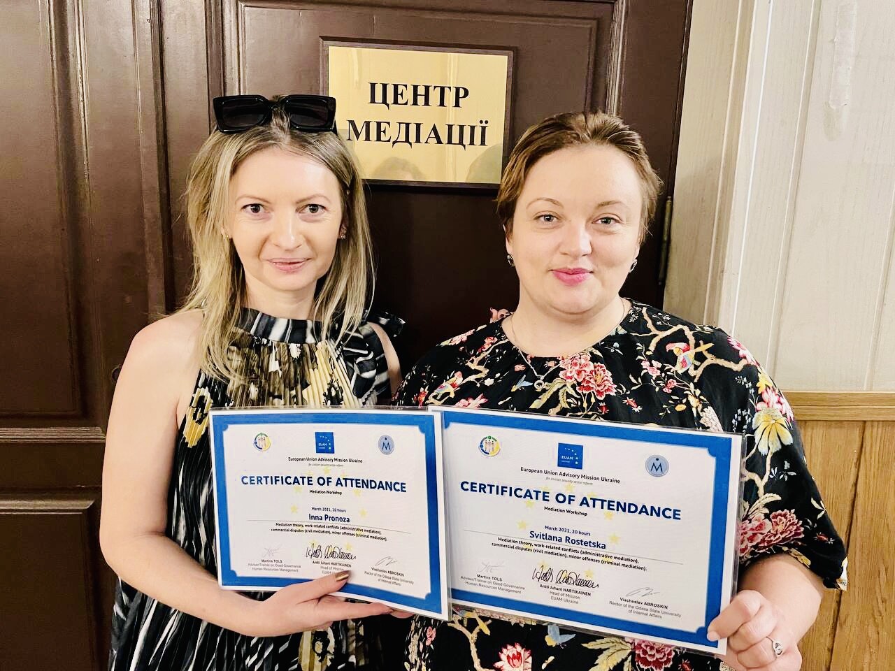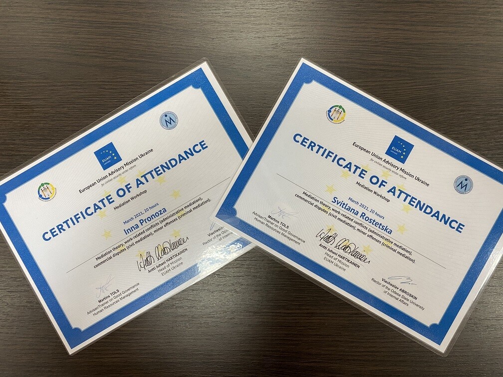 The teachers of the Department of Political Science and Law Pronoza I.I. and Rostetska S.I. during March participated in a series of training seminars "Mediation as a tool for resolving legal disputes", organized by the Mediation Center, Odesa University of Internal Affairs, the South Ukrainian Board of Mediators together with the European Union Civil Security Reform Advisory Mission. As a result of intensive, highly effective and practice-oriented training, teachers gained knowledge and skills in the theory of mediation, administrative, civil and criminal mediation, which will allow for effective implementation in educational and practical activities.