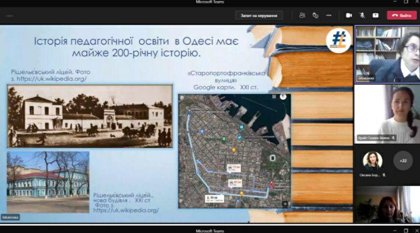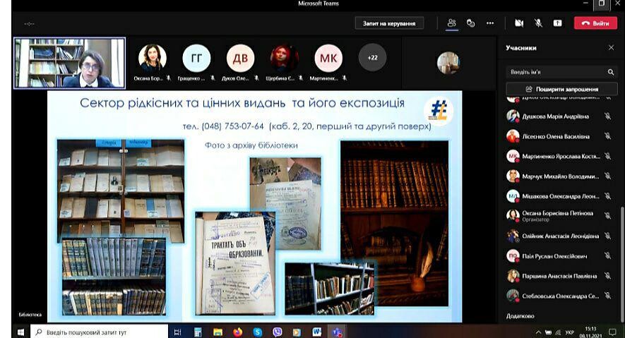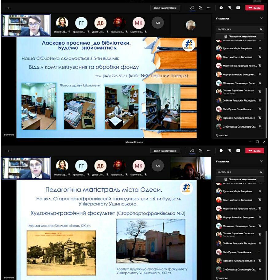 On November 8, 2021, as part of the study of the discipline "Introduction to the specialty" (Professor Oksana Petinova), employees of the library of Ushynsky University were invited to classes and conducted a virtual tour and learned about the features of working with library funds in distance learning.