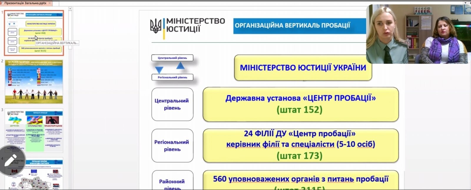 On December 1, 2021, an online meeting was held with I.V. Buyanoska, the Head of the Center, who presented to students the main activities and the role of the Center in the prevention of juvenile delinquency. O.V. Plotnytska, a practical psychologist at the Center, spoke about the psychological features of adolescence and the specifics of probation programs. The students became interested in volunteering at the Center, and some of the higher education students expressed a desire to try themselves as a probation volunteer.