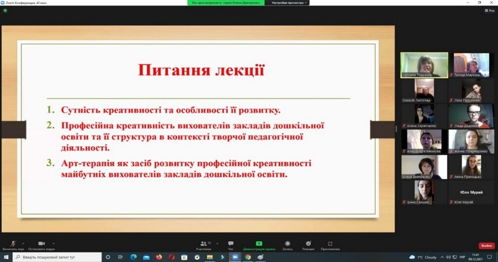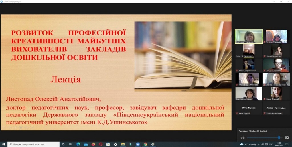 On December 9, 2021, a distance guest lecture on the subject "Child Psychology" was organized and held for the students of the 1st (bachelor's) level of higher education in specialty 012 Preschool Education of Oleksandr Dovzhenko Hlukhiv National Pedagogical University. Oleksiy Anatoliyovych Lystopad, Doctor of Pedagogical Sciences, Professor, Head of the Department of Preschool Pedagogy of South Ukrainian National Pedagogical University named after K.D.Ushynsky, became a guest lecturer. The lecture was devoted to a topical issue - "Development of professional creativity of future educators of preschool education."