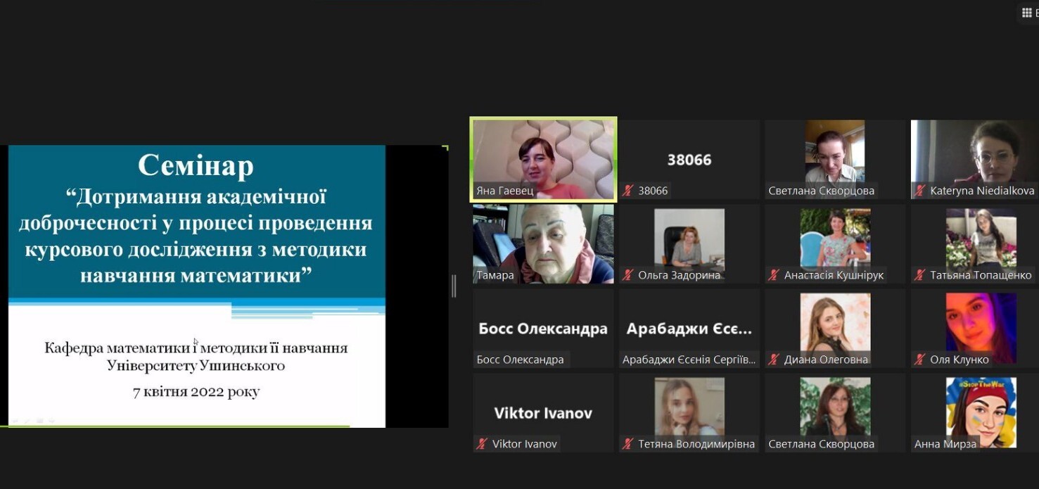 On April 7, 2022, the Department of Mathematics and Methods of Teaching at Ushinsky University within the week of academic integrity held a seminar "Observance of academic integrity in the process of conducting a course study on methods of teaching mathematics."