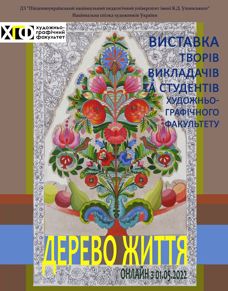 In the virtual exhibition of works by teachers and students of the Faculty of Graphic Arts of Ushinsky University, the image of the Tree of Life is embodied in various arts: realistic and decorative painting, various graphic techniques, batik, tapestry, ceramics, embroideries and applications. The variety of compositional solutions combines the transfer of a powerful movement of life, the desire for light, the joy of flowering and fruit ripening, a sense of shelter in the shade, comfort under the crowns. THE TREE blooms, LIFE goes on! Glory to Ukraine!
