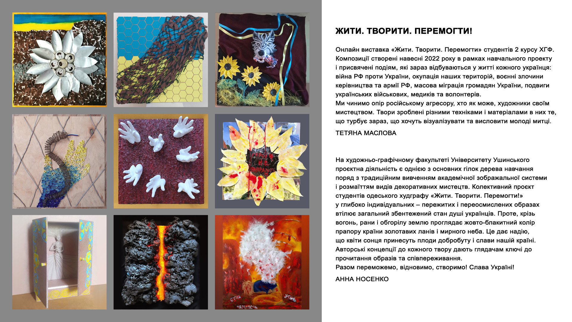 On June 28, 22, on the Constitution Day of Ukraine, the online opening of the exhibition-project “Live. Create. "Win" 2nd year students of the Faculty of Graphic Arts, specialty 014 Secondary education (Fine Arts). The compositions were created in the spring of 2022 and are dedicated to the current events in the life of every Ukrainian - the treacherous war of the Russian Federation against Ukraine, occupation of our territories, war crimes of the russian leadership and military, mass migration of Ukrainian citizens, feats of Ukrainian military, medics and volunteers. We resist the aggressor with our art. The works are made with different techniques and materials, what worries them now is what young artists want to visualize and express.