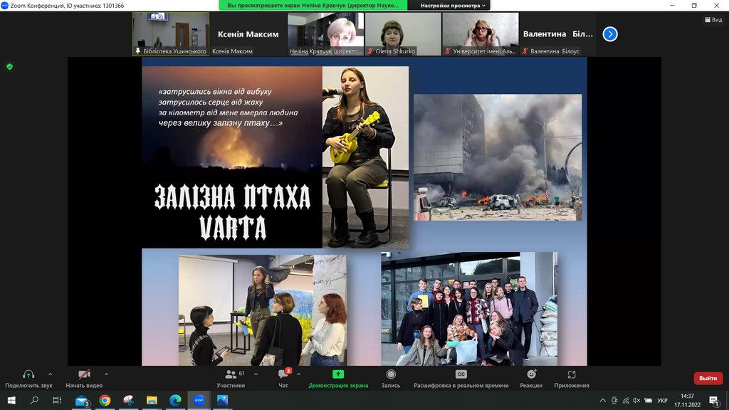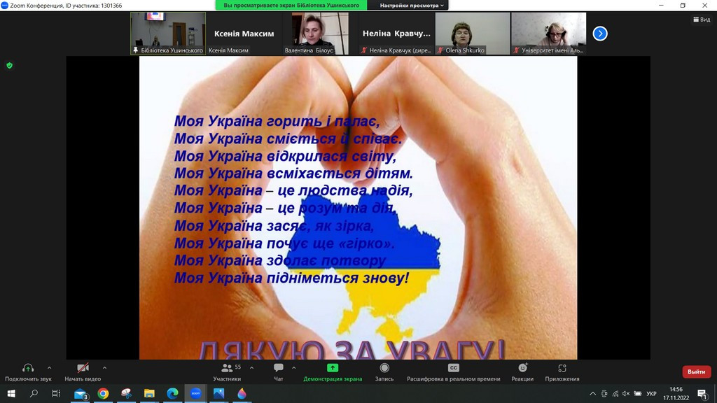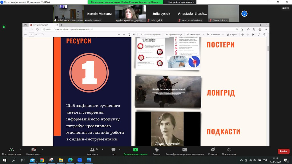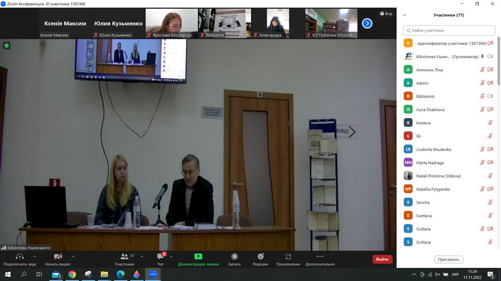 The presentations were made by Ushynsky University staff, representatives of scientific libraries in Odesa and other cities of Ukraine, namely: Odesa National Scientific Library, Odesa Regional Universal Scientific Library named after M. S. Hrushevskyi, Vernadsky National Library of Ukraine, the library of Vinnytsia Mykhailo Kotsiubynskyi State Pedagogical University, the National Scientific Medical Library of Ukraine, the Luhansk Regional Universal Scientific Library, the library of National Pirogov Memorial Medical University, Vinnytsya.