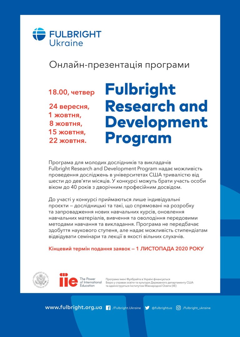 У четвер, 8 жовтня, о 18.00, Офіс Фулбрайта в Україні запрошує всіх зацікавлених на онлайн-презентацію програми. Для участі у презентації просимо виповнити реєстраційну форму: https://cutt.ly/9gwsSSJ.