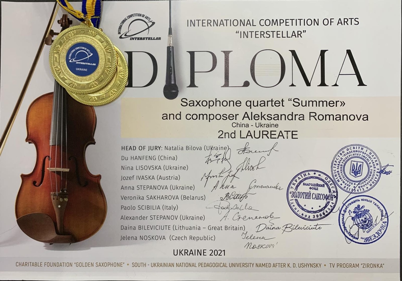 У першій декаді квітня завершилися підсумки результатів І Міжнародного конкурсу мистецтв «INTERSTELLAR». Засновником і президентом 1 Міжнародного конкурсу «INTERSTELLAR» є Анна Степанова – голова благодійного фонду «Золотий саксофон», лауреат міжнародних конкурсів, одна з провідних саксофоністів України, артистка Сельмер Париж, BG France, викладач факультету музичної та хореографічної освіти Університету Ушинського. Головою журі конкурсу була запрошена Наталія Костянтинівна Білова, декан факультету музичної і хореографічної освіти Університету Ушинського, професор, Заслужений працівник освіти України.