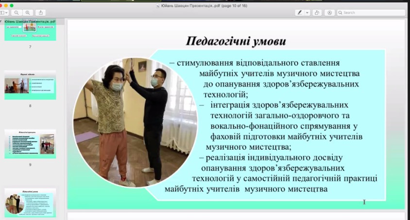 В Університеті Ушинського 25.11.2022 р. на факультеті музичної та хореографічної освіти було проведено прилюдний захист дисертації Юань Шаоцянь «Формування вокально-фахової компетентності майбутніх учителів музичного мистецтва на засадах здоров’язбережувальних технологій» на здобуття наукового ступеня доктора філософії з галузі знань 01 Освіта/педагогіка за спеціальністю: Середня освіта (предметна спеціальність: Музичне мистецтво).