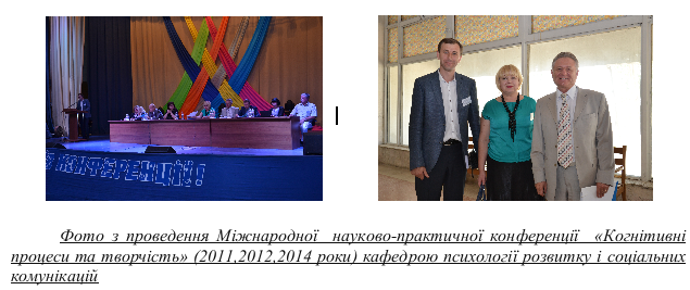 Серед означеного традиційною є Міжнародна науково-практична конференція «Когнітивні процеси та творчість», яка проводиться кафедрою вже вп'яте. Так, на V Міжнародній науково-практичній конференції «Когнітивні процеси та творчість», яка проводилась 14-15 вересня 2014 року продемонстровано високий науковий рівень доповідей. У роботі конференції приймали участь психологи, медичні та педагогічні працівники. Доповіді було присвячено науковим дослідженням за наступними тематичними напрямами: когнітивні процеси (сучасні напрями дослідження); інтелектуальні здібності та їх розвиток у різних видах діяльності; творча діяльність особистості та її механізми; сучасна картина світу (ціннісний, когнітивний, лінгвістичний та темпоральний аспекти виміру); інноваційні психологічні технології діагностики і розвитку когнітивних процесів та творчих здібностей особистості. Було проведено шість майстер-класів провідними фахівцями у відповідних галузях.