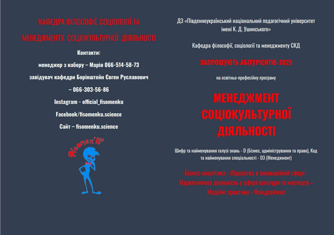 Кафедра філософії, соціології та менеджменту соціокультурної діяльності входить до складу соціально-гуманітарного факультету. Вона була створена в 1992 р. Очолив її відомий український філософ, академік Української академії політичних наук та Інженерної академії України, доктор філософських наук, професор Анатолій Кавалеров. З травня 2013 року завідувачем кафедри є доктор філософських наук, професор Євген Борінштейн, який успішно продовжує традиції свого вчителя. Кафедра є базовою для підготовки здобувачів вищої освіти зі спеціальностей: за першим (бакалаврським) рівнем – 028 Менеджмент соціокультурної діяльності, 033 Філософія, 034 Культурологія; за другим (магістерським) рівнем – 033 Філософія; за третім (освітньо-науковим) рівнем – 033 Філософія. Науково-педагогічні працівники кафедри забезпечують викладання обов’язкових та вибіркових освітніх компонентів на всіх факультетах Університету.