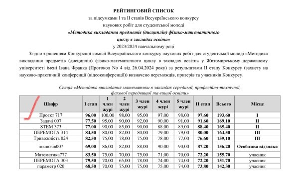 We congratulate Kateryna Poluyaktova, the student of the Educational and Scientific Institute of Natural and Mathematical Sciences, Informatics and Management, who, based on the results of two rounds and a video conference defense, won a convincing victory and took 1st place at the II stage of the All-Ukrainian competition of scientific papers for student youth in specialty "Methodology of teaching subjects (disciplines) of the physical and mathematical cycle in educational institutions" in 2023/2024 academic year at Zhytomyr Ivan Franko State University (protocol No. 4 dated April 26, 2024).