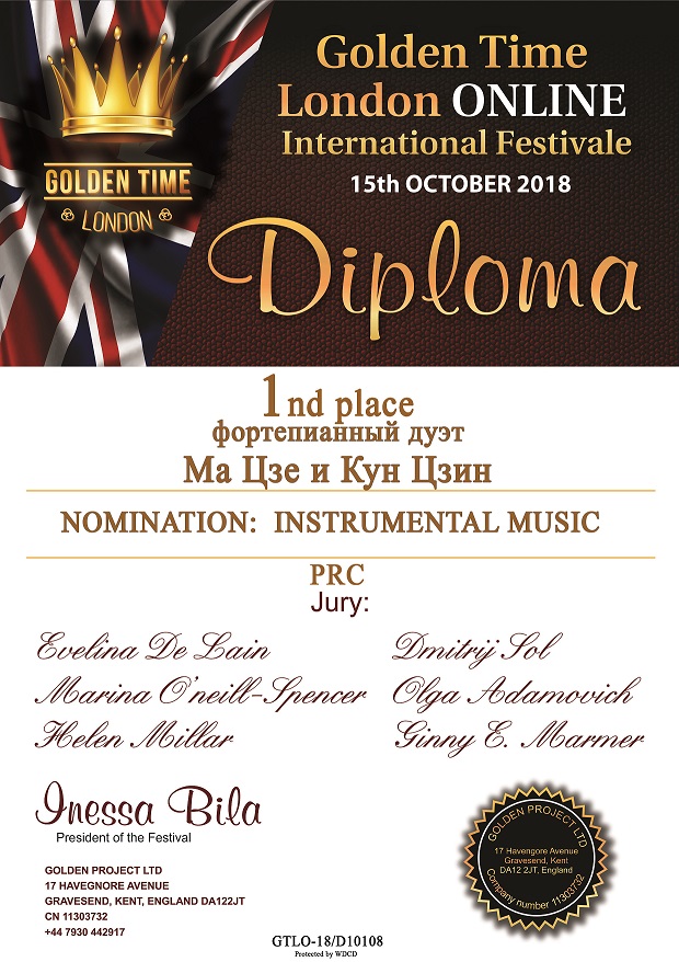 The results of the International Festival "GOLDEN TIME LONDON", which was attended by representatives of more than 15 countries, was announced on October 15, 2018 in London. At the festival South Ukrainian National Pedagogical University named after K. D. Ushynsky has been represented by Master’s Degree students of the Faculty of Music and Choreography. Ma Zee and Kun Jing (class of associate professor O. Yu. Horozhankina) in the piano duo have won the category "Instrumental genre" and become laureates of the 1st degree.