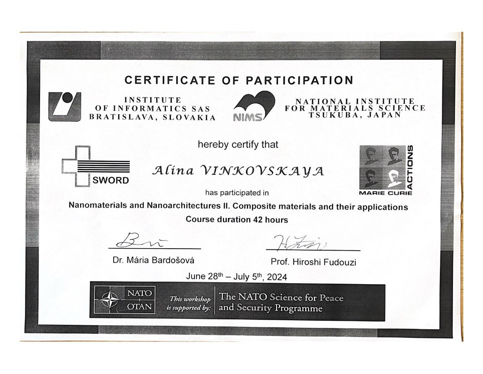 У період із 28.06.2024 до 05.07.2024 у місті Братислава (Словаччина) відбулася конференція під назвою «Nanomaterials and Nanoarchitectures II. Composite Materials & Their Applications» за підтримки програми НАТО «Наука заради миру та безпеки» (The NATO Science for Peace and Security Programme). Захід особисто відвідала аспірантка другого року навчання А. О. Вінковська, науковим керівником якої є доктор фізико-математичних наук, професор А. Ю. Ків. На конференції вона виступила з доповіддю та мультимедійною презентацією про результати своєї наукової праці, а саме про розробку механізму роботи нашої програми для дослідження біосенсорів.