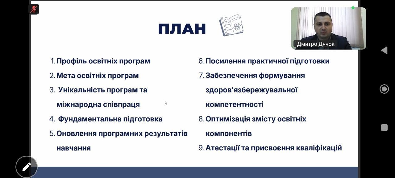 Завідувач кафедри інноваційних технологій та методики навчання природничих дисциплін, кандидат фізико-математичних наук, доцент Дмитро Дячок представив проєкти освітньо-професійних програм 2026 року «Середня освіта (Фізика. Математика)» та «Середня освіта (Природничі науки)» першого (бакалаврського) рівня вищої освіти, гарантом останньої з яких він є.
