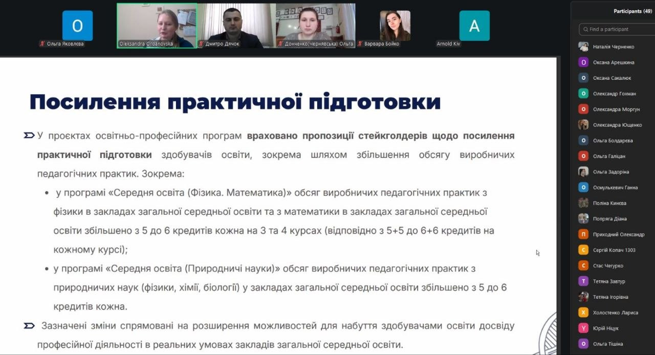 Продовжуючи обговорення проєктів освітньо-професійних програм, Олександра Ордановська, гарант освітньо-професійної програми «Середня освіта (Фізика. Математика)» першого (бакалаврського) рівня вищої освіти, представила результати роботи робочих груп із їх перегляду та оновлення. Було наголошено, що напрацьовані зміни спрямовані, по-перше, на посилення практичної підготовки здобувачів освіти з урахуванням пропозицій стейкголдерів, що відобразилося у збільшенні обсягу виробничої педагогічної практики та оновленні її змісту. По-друге, здійснено корекцію та уточнення формулювань окремих програмних результатів навчання для більш прозорого і чіткого їх увідповіднення визначеним у професійному стандарті учителя трудовим функціям учителя.