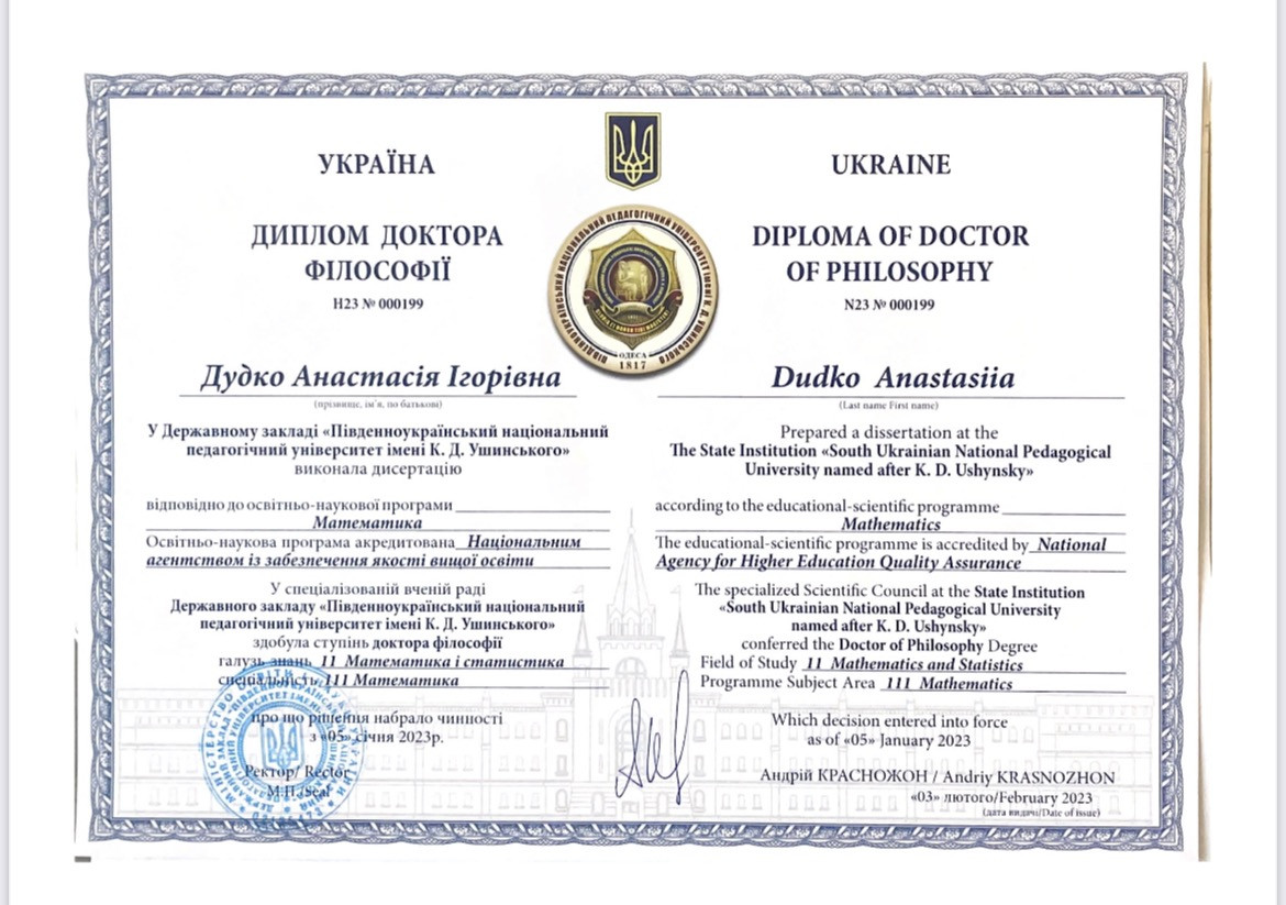 Вітаємо викладача-стажиста кафедри вищої математики і статистики Дудко Анастасію Ігорівну з отриманням диплома доктора філософії відповідно до освітньо-наукової програми Математика за результатами успішного захисту дисертаційного дослідження на тему: «Скінченновимірні спектральні задачі на графах» за спеціальністю 111 Математика (науковий керівник – доктор фізико-математичних наук, професор, завідувач кафедри вищої математики і статистики Вячеслав Миколайович Пивоварчик).